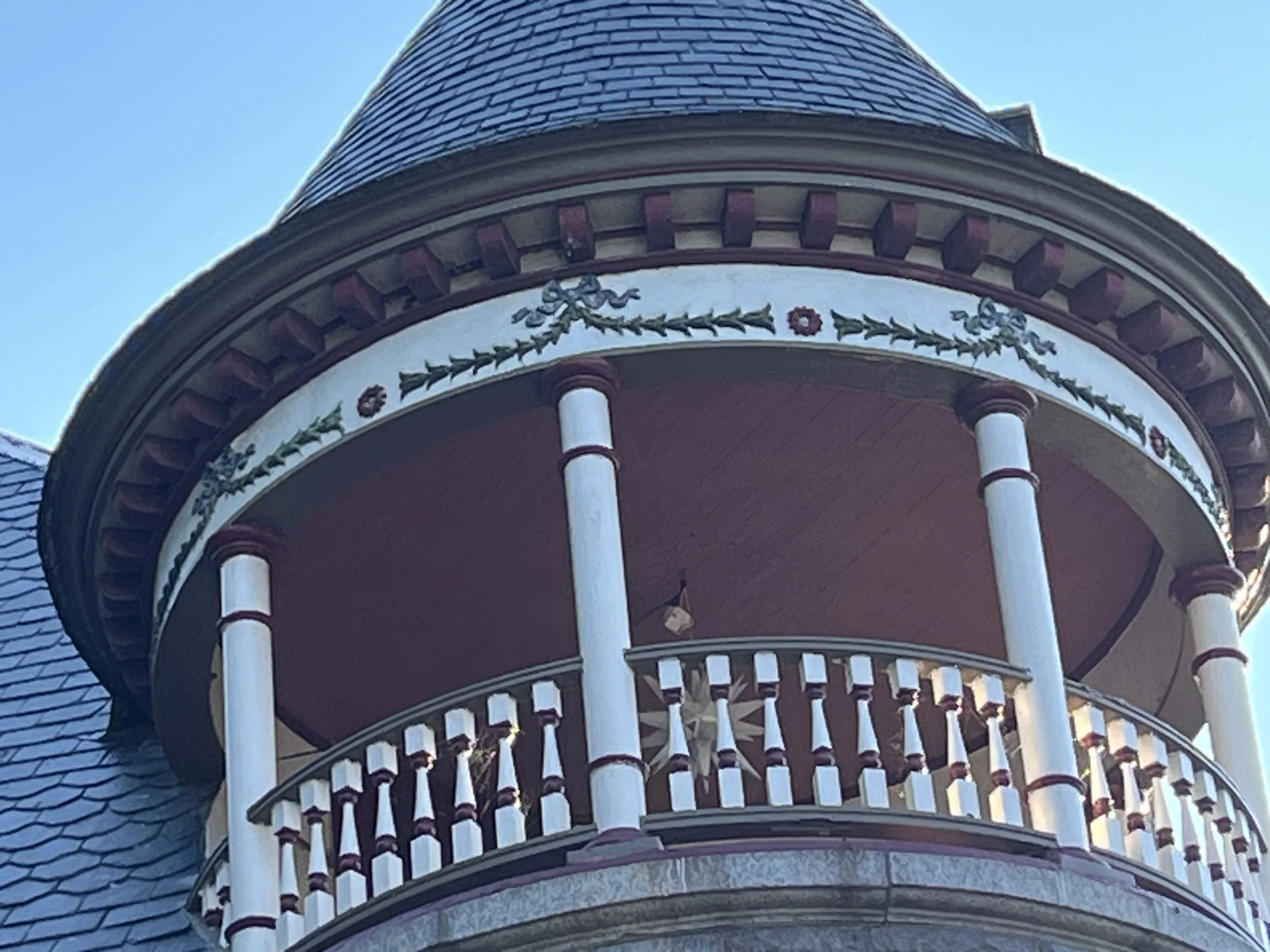 I knew I was in the right place when I spotted a Moravian star in the turret on top of the mansion’s roof. Carol had visited Bethlehem, fell in love with the stars, and brought two home with her. The other one hangs in the front porch, providing a real Moravian welcome to her guests.